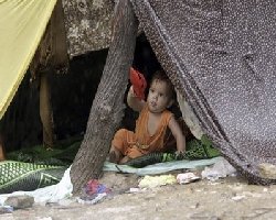 A child affected by floods sits in make-shift tent in Nowdhera, Pakistan on Sunday, Aug. 8, 2010.