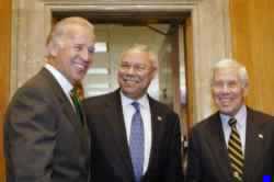 U.S. Secretary of State Colin Powell, (C) shares a laugh with Senator Joseph R. Biden, Jr. (D-DE), Chairman of the U.S. Senate Foreign Relations Committee, (L) and Senator Richard Lugar (R-IN) before testifying at a hearing on the Moscow Treaty and strategic offensive reductions on Capitol Hill, July 9, 2002. The committee is reviewing details of the Moscow Treaty. REUTERS/Hyungwon Kang