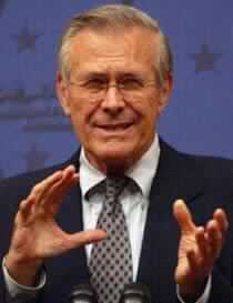 Donald Rumsfeld speaks to the media in Baghdad Saturday Sept. 6, 2003. (AP Photo/Murad Sezer)