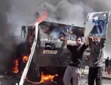Iraqi Shi'ite supporters of cleric Moqtada al-Sadr celebrate near a burning U.S. Army truck in the Shuala neighborhood of Baghdad April 5, 2004. (Ceerwan Aziz/Reuters)