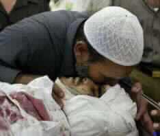 A relative kisses the body of Palestinian Medhat al-Yazij, 22, before the start of his funeral in Gaza, August 23, 2002. Israeli soldiers killed two armed Palestinians trying to infiltrate a Jewish settlement on Friday, hours after a Palestinian minister failed to convince militants to back an end to attacks against Israelis. The gunmen, dressed in Israeli army uniforms and armed with assault rifles and hand grenades, were shot dead in exchanges of fire with troops, after they were spotted near the security fence at the Kfar Darom settlement in the Gaza Strip, the army said. REUTERS/Oleg Popov
