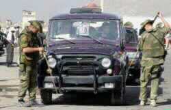 International Security Assistance Force, ISAF, inspect a car for explosives with a sniffer dog at the entrance of a stadium where people gather for a ceremony to mark the first anniversary of the slaying of Ahmed Shah Massood in Kabul, Afghanistan, Monday, Sept. 9, 2002, Massood, a legendary Afghan commander, was killed on Sept. 9, 2001 by suicide bombers believed sent by Osama bin Laden. (AP Photo/Kamran Jebreili)