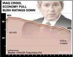 President Bush's attempts to juggle a soft economy, a potential war with Iraq and a nuclear standoff with North Korea are taking a toll on his political standing, as Democrats line up to challenge him for reelection. A Gallup poll released on January 14, 2002 showed Bush with a 58 percent overall approval rating among Americans, down from 63 percent a week earlier and from a record high of 90 percent in mid-September 2001, when Americans rallied around their president after the Sept. 11, 2001, attacks. (Reuters Graphic)